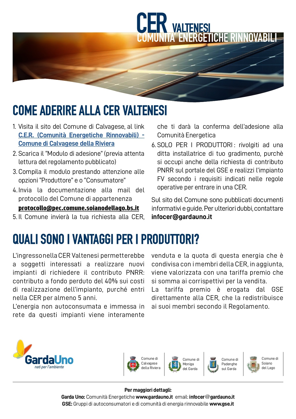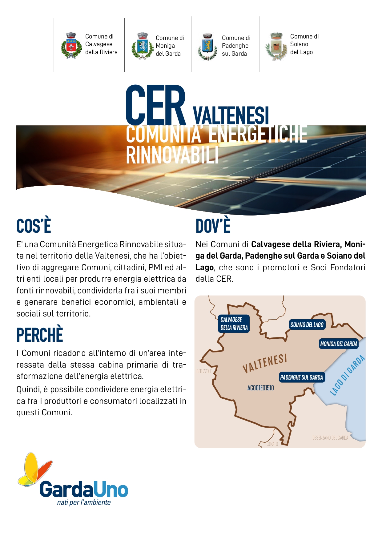 Giovedì 6 novembre alle ore 20:30, nella sala consiliare del Comune di Soiano del Lago, si terrà un’assemblea pubblica sulla CER Valtenesi, la Comunità Energetica Rinnovabile che unisce cittadini, imprese e amministrazioni per produrre e condividere energia pulita, riducendo inquinamento e costi e costruendo insieme un futuro più sostenibile.